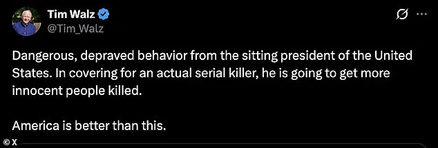 He accused Trump of ‘covering for an actual serial killer’ and warned that the president’s rhetoric could endanger more lives. ‘America is better than this,’ Walz said, emphasizing the need for unity in the wake of the tragedy.