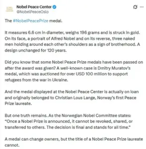 Her words, however, were met with immediate pushback from the Nobel Committee, which reiterated that while physical medals may change hands, the title of laureate remains irrevocably tied to the original recipient.