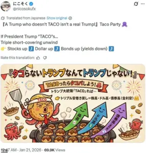 So glad I believed in Trump-san’s TACO,’ using the honorific ‘Trump-san’ to express a surprising level of respect for the president.