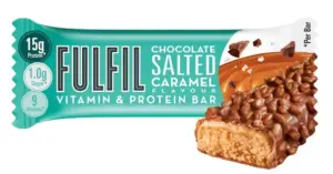 One such example is the Fulfil Chocolate Salted Caramel Vitamin & Protein Bar, priced at £2.90 for a 55–gram bar at tesco.com.