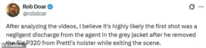 Dobar pointed to footage showing an agent removing Pretti’s Sig Sauer P320 from his holster as he exited the scene, positing that the weapon may have fired accidentally in the agent’s hands, prompting a subsequent shot from another officer.