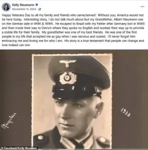 Neumann’s post, which was initially intended as a tribute to her family’s military service, has instead become a lightning rod for criticism, with many questioning how a descendant of a Nazi could align herself with the values of Veterans Day, a holiday dedicated to honoring Allied veterans who fought for freedom.